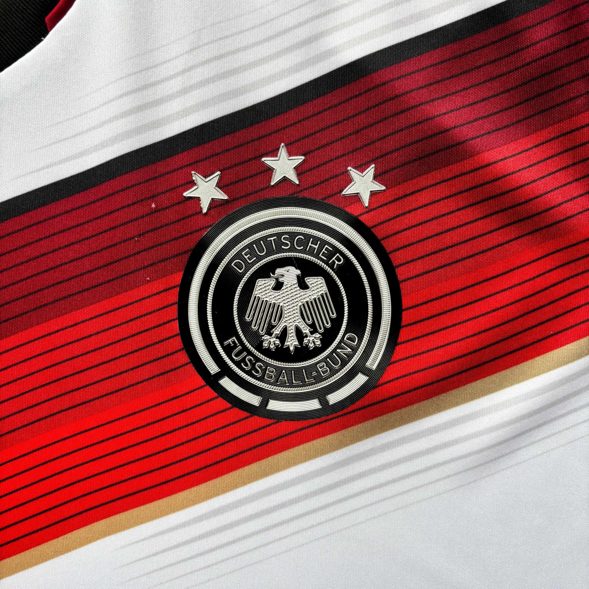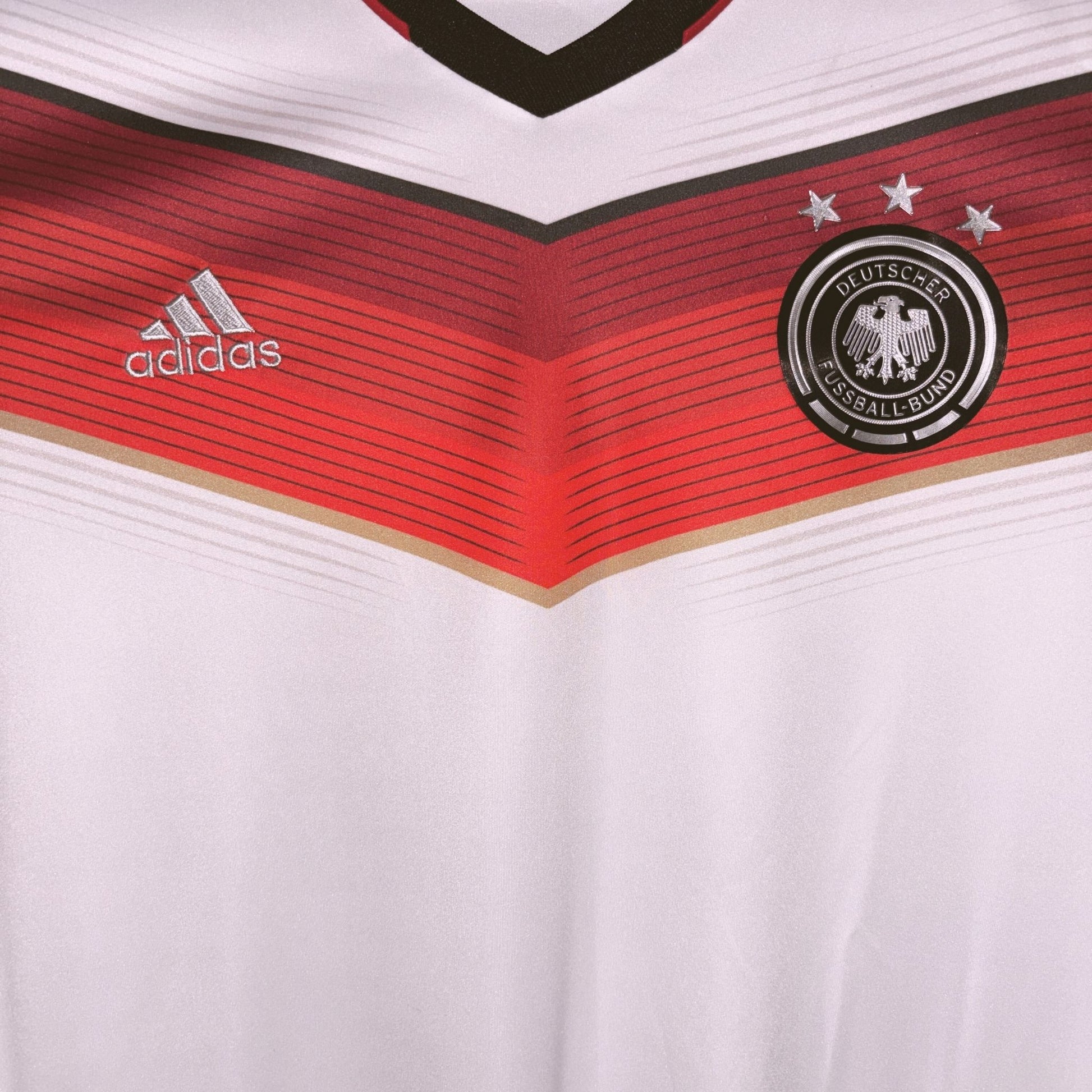 The shirt of champions. Germany lifted their fourth World Cup in Brazil wearing this beauty - a clean white base with a bold red chevron across the chest. Sharp, modern, and instantly iconic, it was the kit of Lahm, Müller, Schweinsteiger and Götze’s unforgettable final winner. A piece of history from the night Germany conquered the Maracanã.